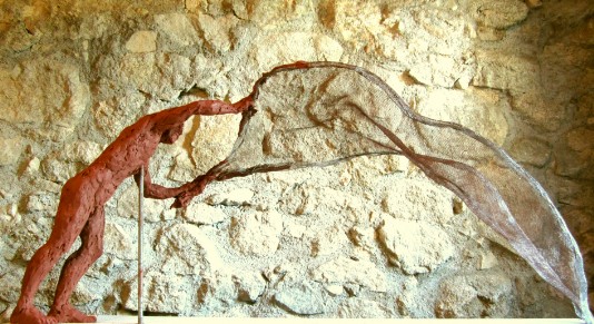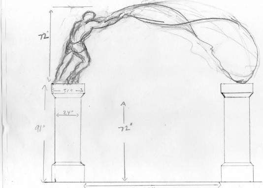 Les considérations pratiques avec cette sculpture impliquaient de placer une figure grandeur nature et un grand filet de coulée dans une situation exposéesur des piliers qui relient la ville de Plymouth à l'église Minster, et des considérations structurelles qui étaient nécessaires à la construction d'une arche danslaquelle la figure serait faite de résine de bronze, et le filet d'acier inoxydable. Les deux premières images montrent le dessin initial et la maquette en argile avec un filet en aluminium tissé.